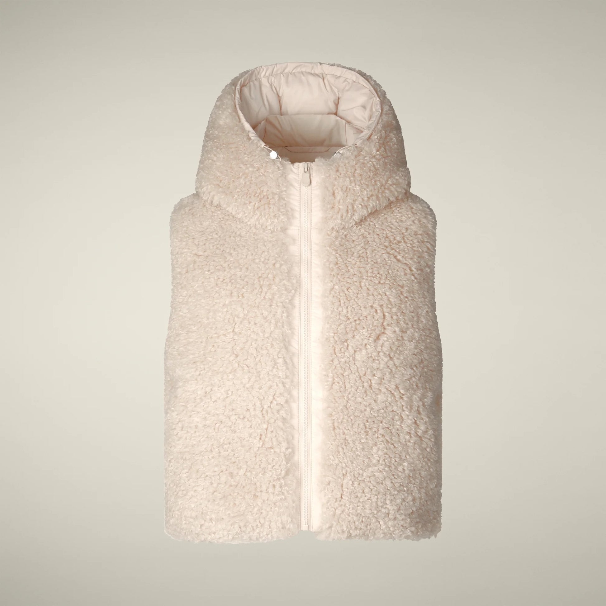 The Ayla model women’s puffer vest in faux shearling is designed with animal-free padding to keep you warm between seasons. A drawstring hood and hem offer easy adjustability, while snap-buttoned welt pockets add everyday practicality. The look is completed by our signature round logo and custom puller. 100% recycled polyester, curly faux fur.